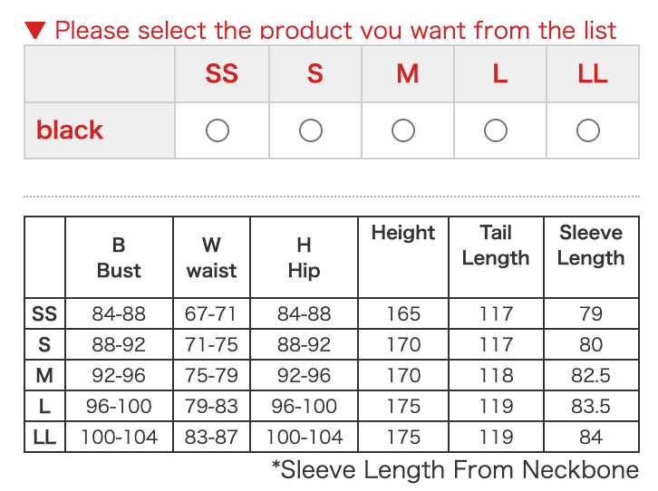 | Size | B Bust | W waist | H Hip | Height | Tail Length | Sleeve Length |