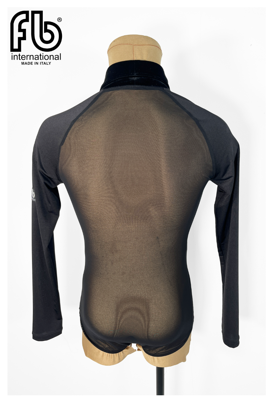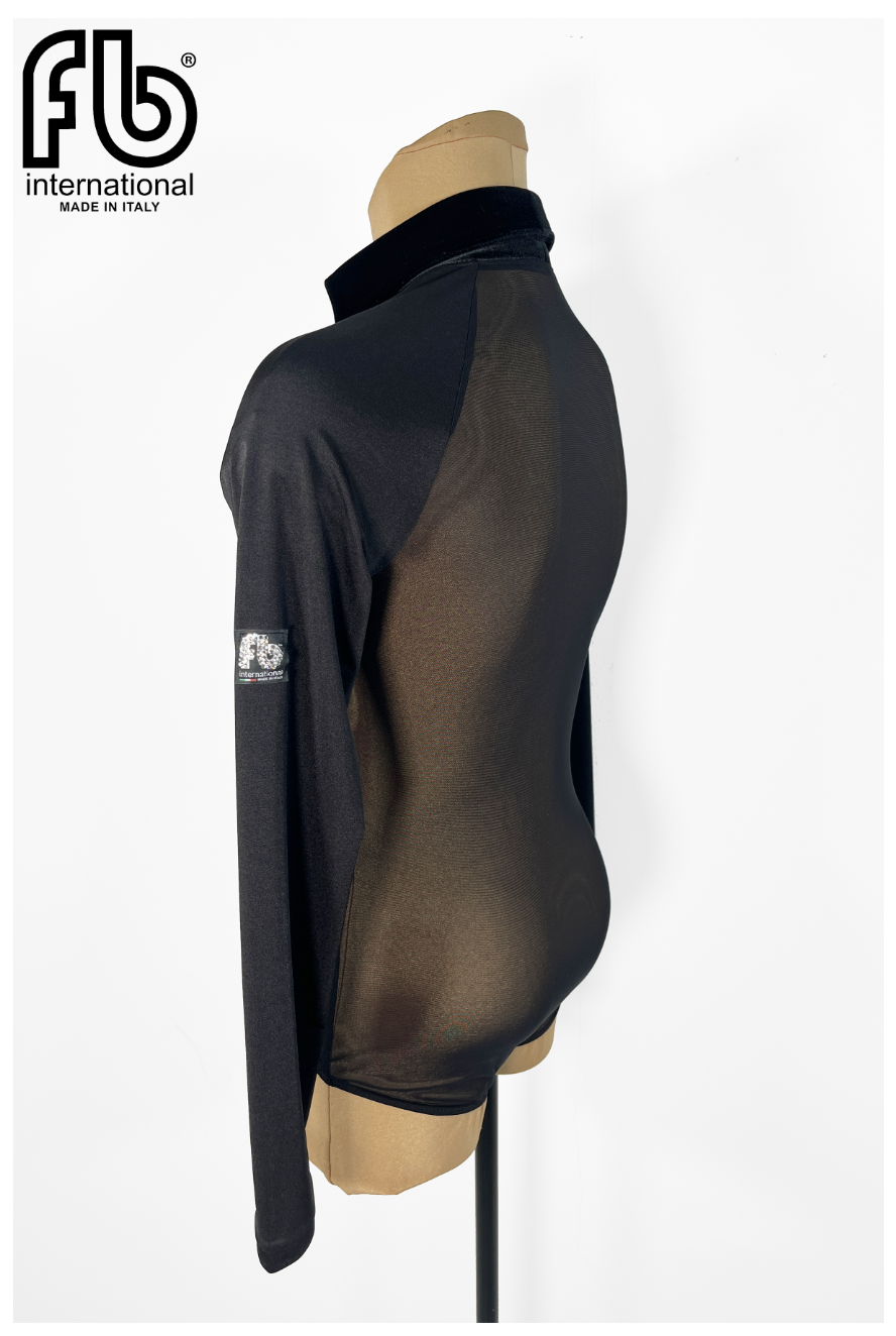 Men's shirt for latin dance made of black crepe with vlevet shirt collar and deep neckline, rouches on the sides of the chest to give more volume to the figure.