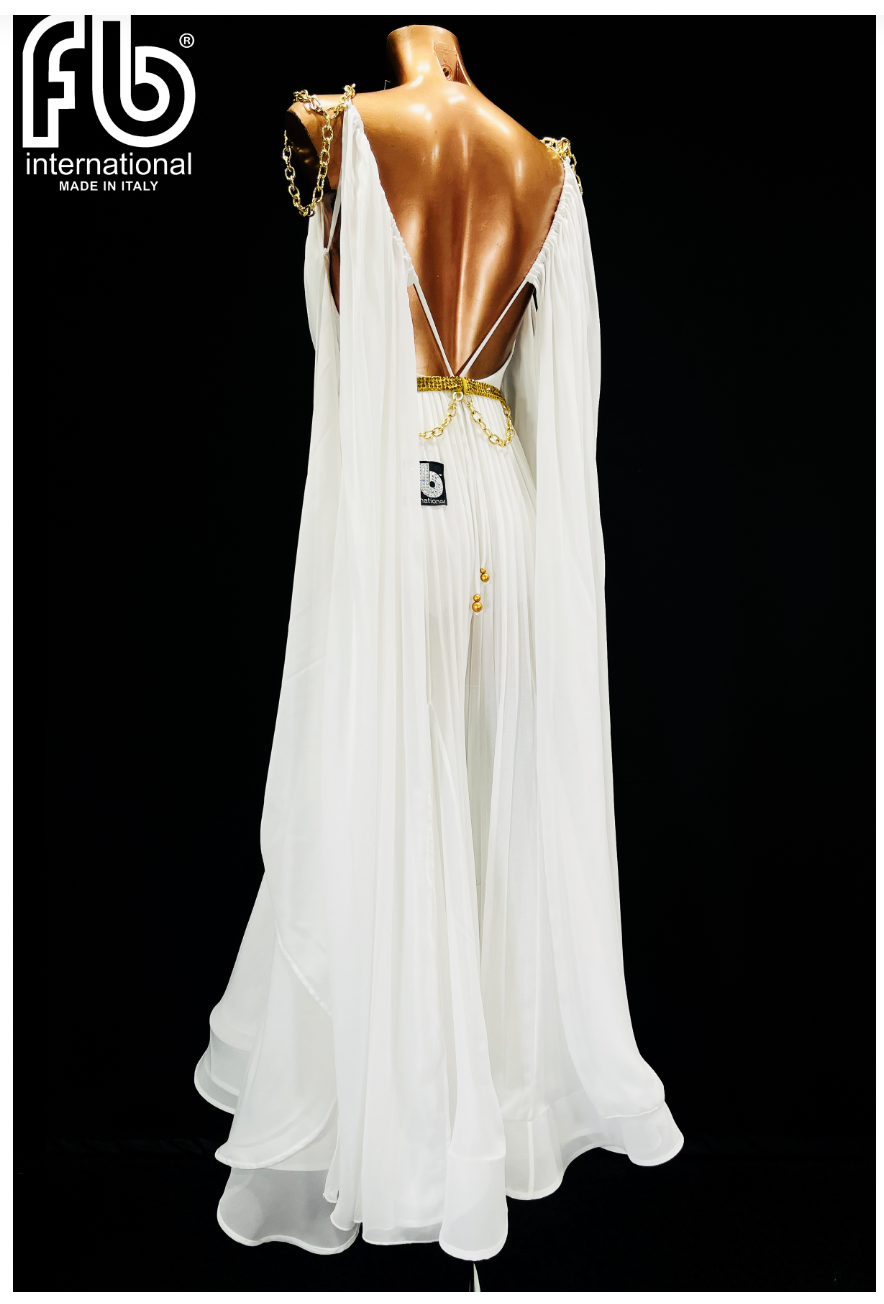 Women's dress for standard dance made of lightweight white georgette with side slits and crinoline at the bottom of the skirt, gold belt with rhinestones, wings with gold chains at the wrists and gold stones on the neckline.
