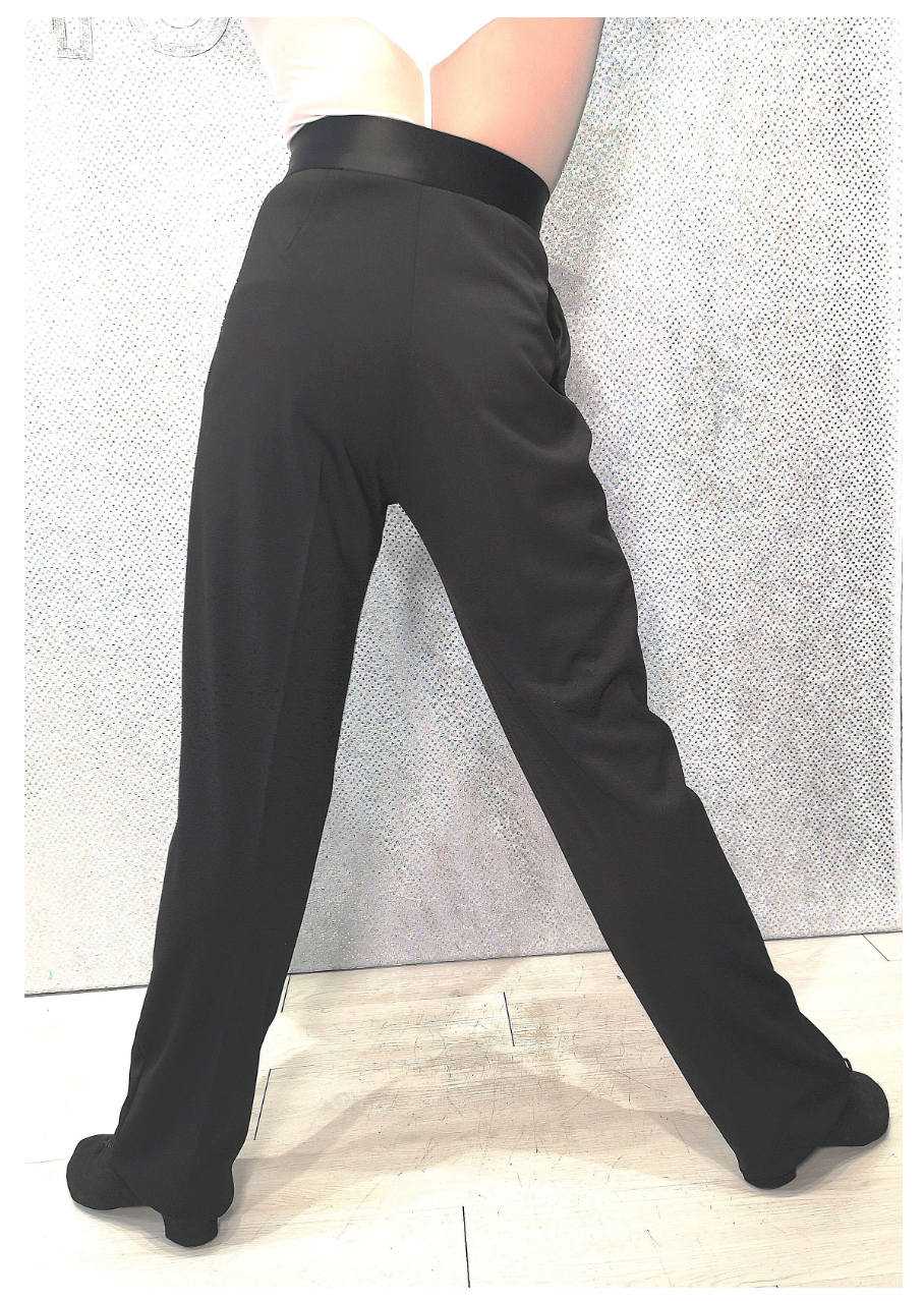 High waist, high quality satin belt h. 4,5 cm, pence, leg not too wide that covers shoes' strings.
