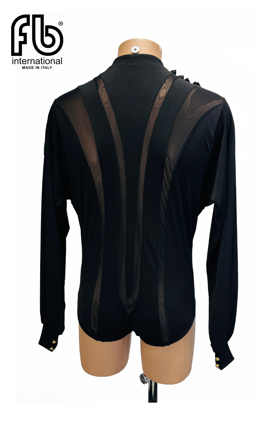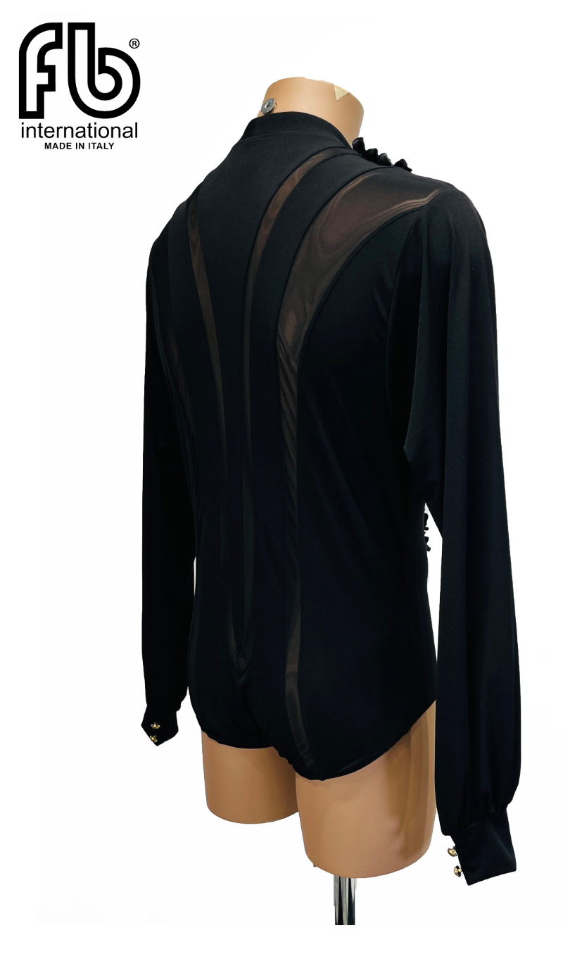 Men's Latin dance shirt made of crèpe, with rouches and bat sleeves, adorned with gold buttons.