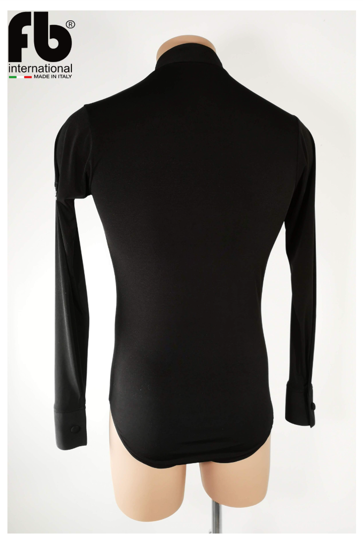 Men's shirt for latin dances, made of black crepe with mandarin collar and cuffs with buttons.