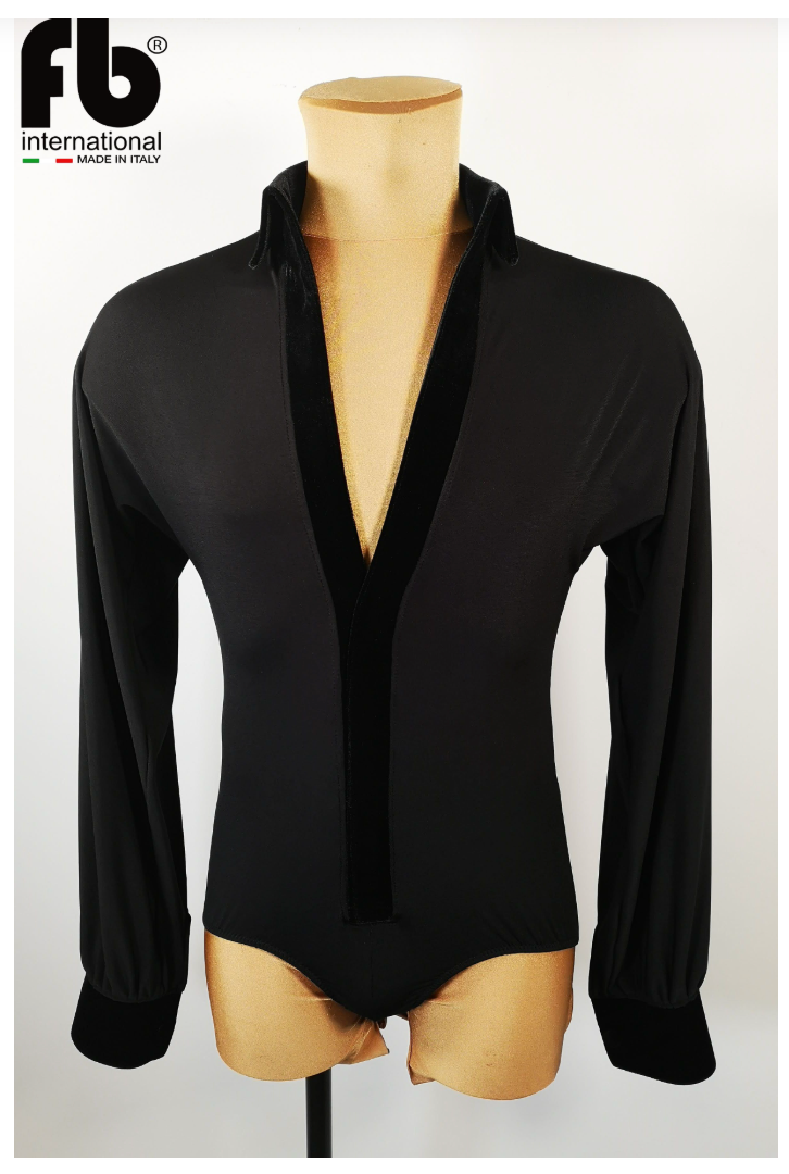 Men's shirt for latin dance made of black crepe with velvet collar anche cuffs.