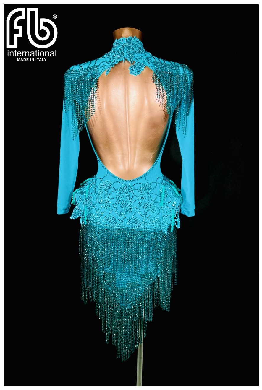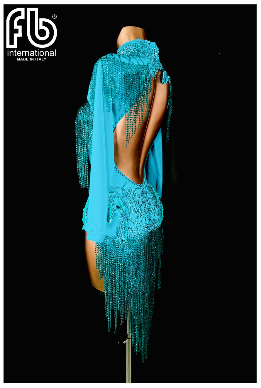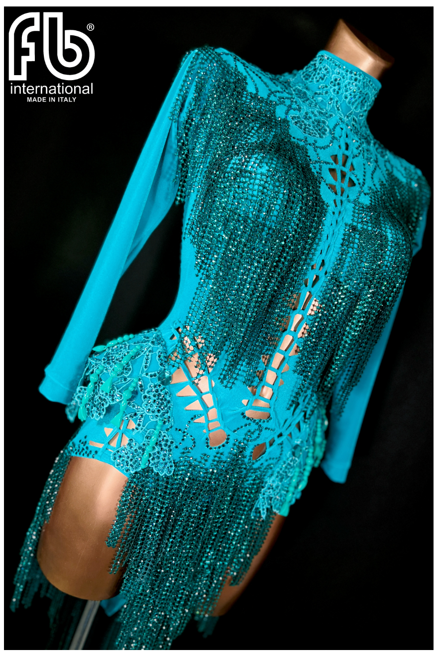 Women's dress for latin dance made of a bright petrol green velvet, handmade cuts and 3D wings on the hips with green beaded threads, embellished with petrol rhinestone net embroidery and lace with tone-on-tone rhinestones, pointed skirt with rhinestone fringes.