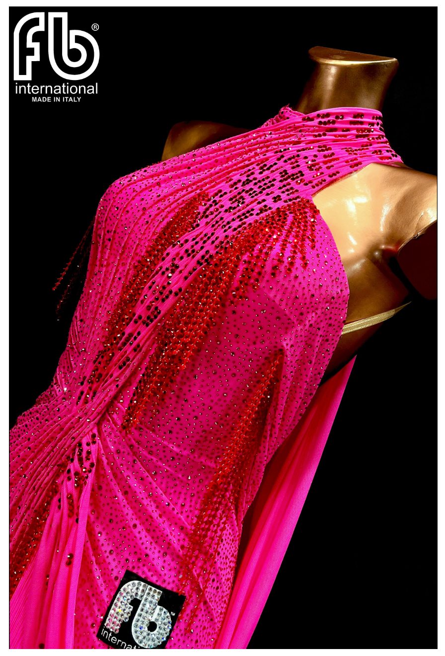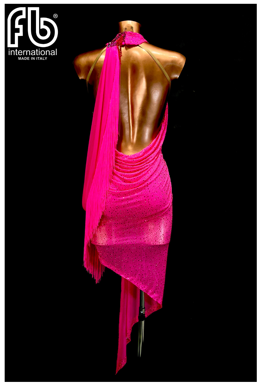 Women's dress for Latin dances in fuchsia mesh and red rhinestone net fringe.