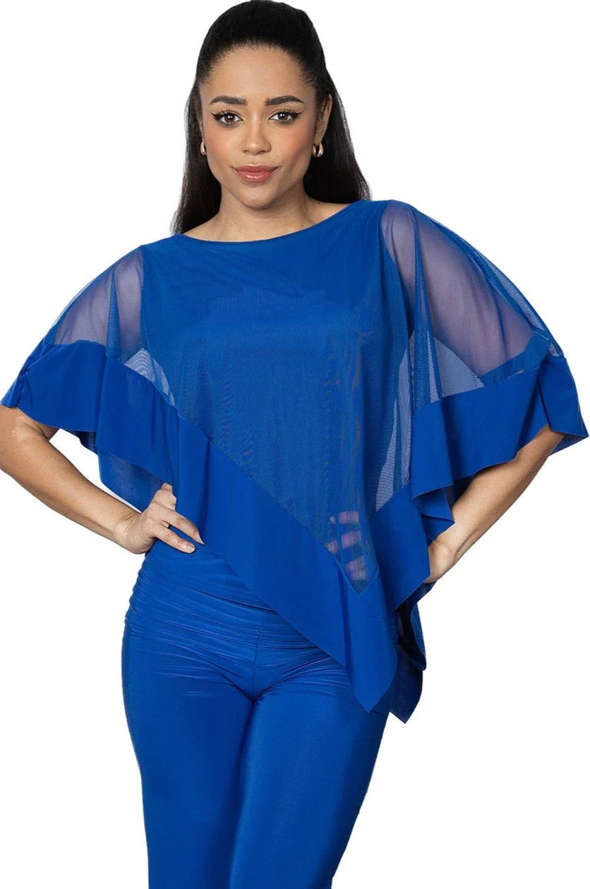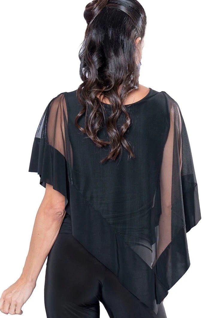 Introducing our Diagonal Mesh Caplet Top, the perfect combination of comfort and elegance. This asymmetric mesh over-layer cape top comes with a tank undershirt, making it not only stylish but also practical for ballroom dancing. Elevate your dance attire with this sophisticated and exclusive piece.