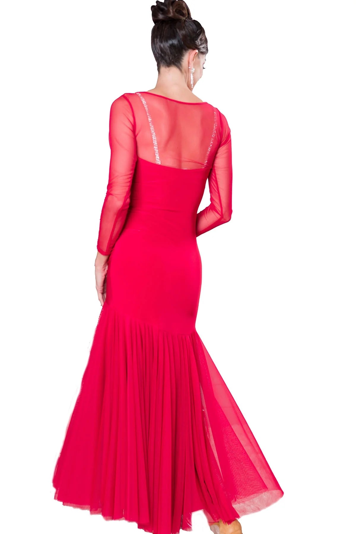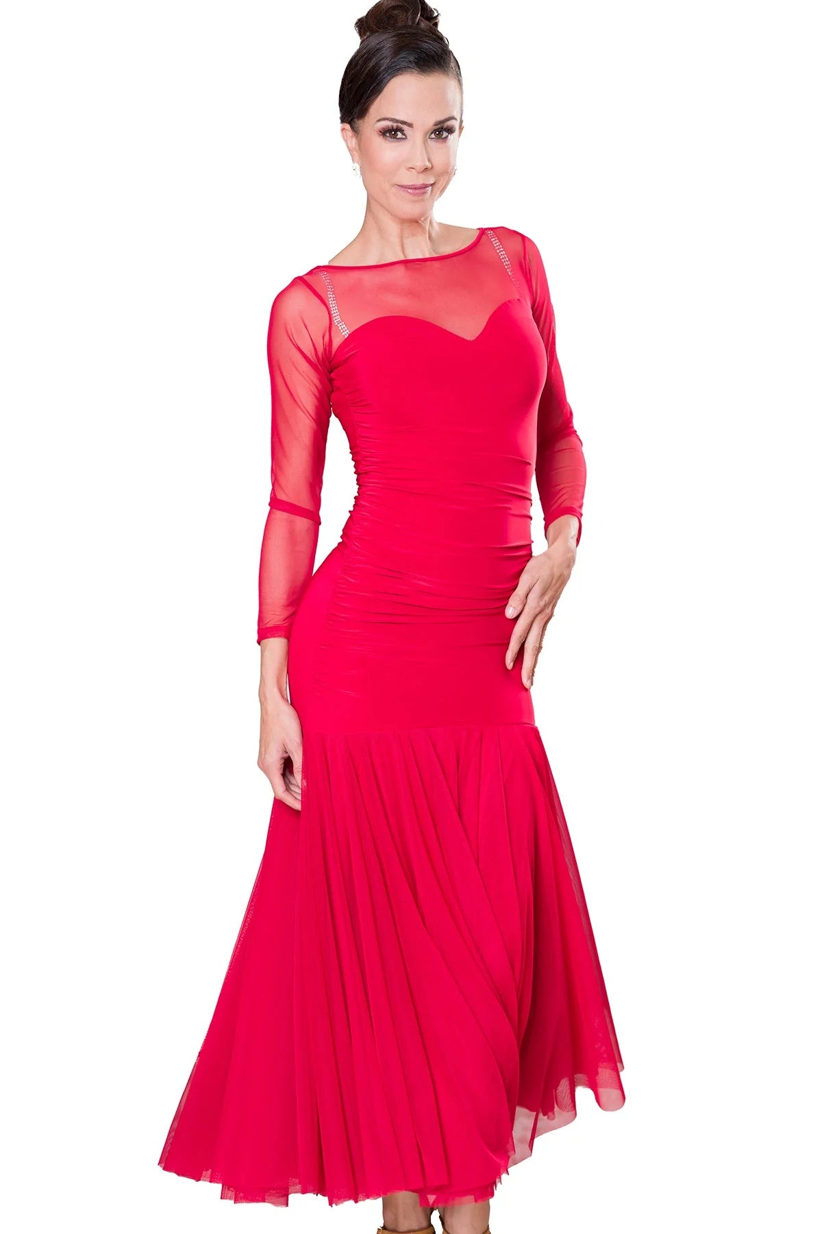 Made of 4 full circles of powermesh fabric, this dress not only flows beautifully on the dance floor but also accentuates your every turn. The ruched sweetheart neckline adds a touch of elegance, making you stand out from the crowd.