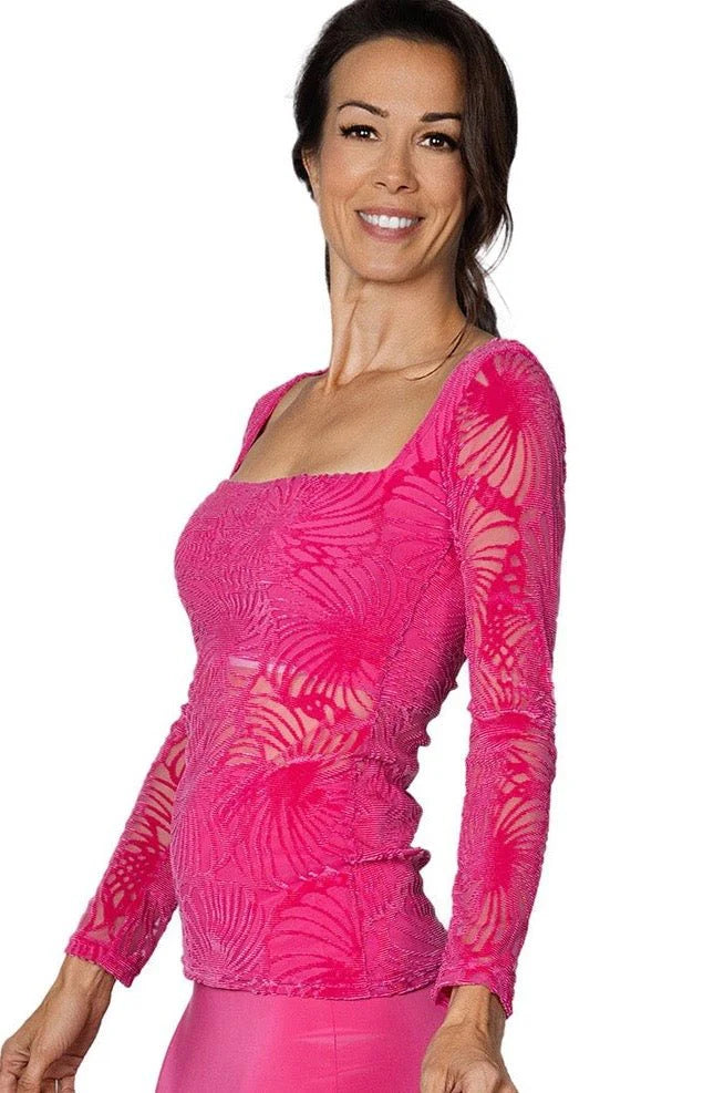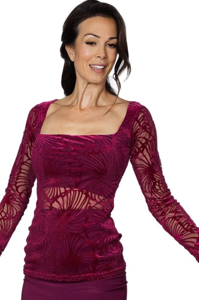 Unleash your adventurous side with our T2420 Square Neck Burnout Velvet Top! Featuring beautiful burnout velvet that enhances the beauty of your skin, this top is perfect for ballroom lessons or parties. Make a statement and stand out from the crowd.