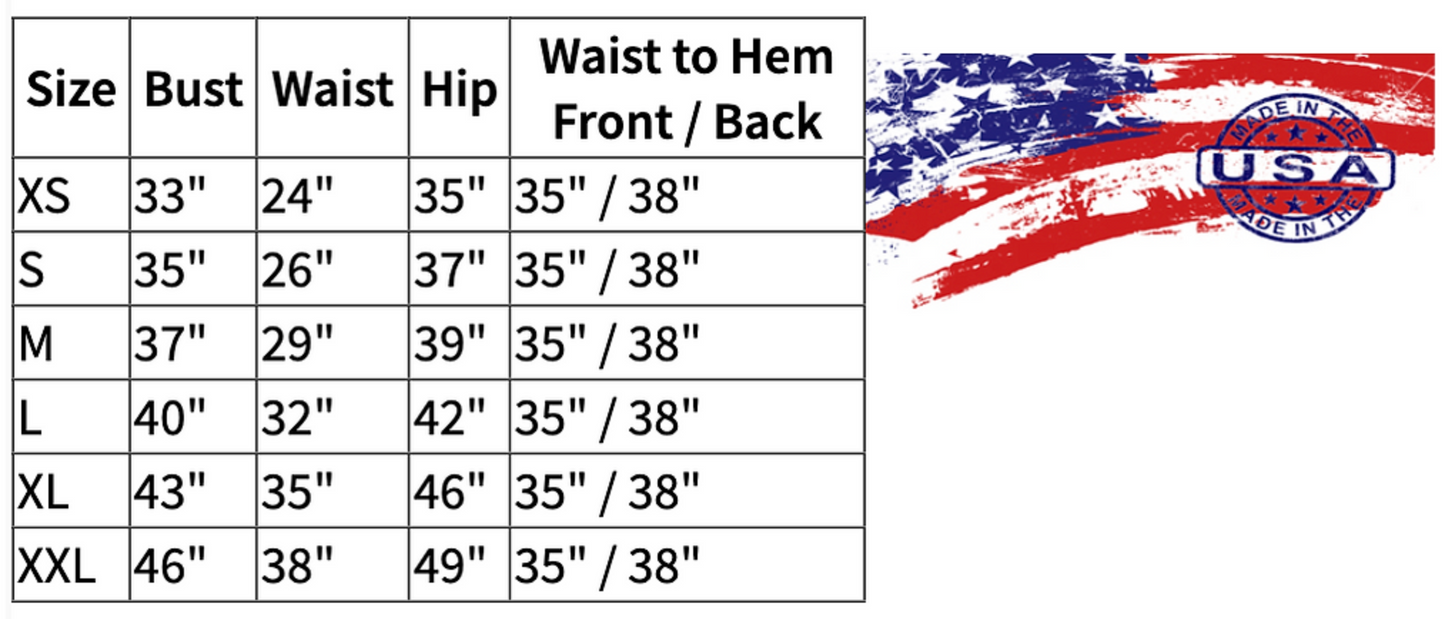 | Size | Bust | Waist | Hip | Waist to Hem Front / Back |