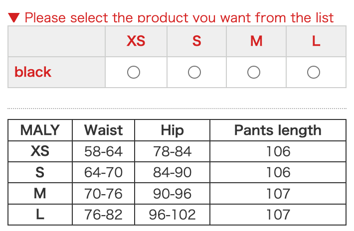 | Size | Waist | Hip | Pants length |