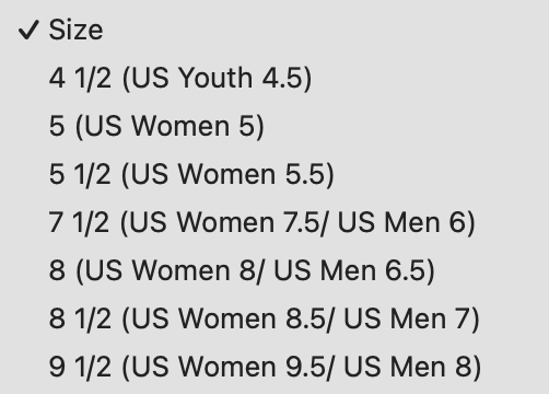 Review sizing recommendations for each specific product. Specify size during the checkout.